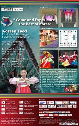 喜欢韩国冷面、泡菜、烤肉等美食的朋友别错过由韩国政府出资举办的第一届韩国美食节(Korean Food Products & Beverages Exhibition Toronto 2010) 。届时民衆在会内可以品尝纯正韩国美食、学习制作韩国美食,还可以欣赏到优美的韩国民间舞蹈,以及传统的韩国结婚仪式等等。喜欢韩国美食与文化的朋友,千万不要错过这个活动了。